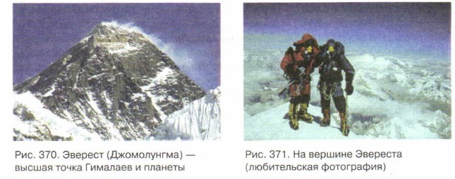 Евразия — музей природы планеты земля Геологическое строение и рельеф ЕвразииСовременный рельеф ЕвразииРельеф Евразии очень сложен. Он представляет собой сетчатую структуру. Ячейками этой сети являются равнины, между которыми находятся горные пояса разного возраста и облика. В Евразии чередуются равнины и горы. Именно поэтому на материке много пространств, со всех сторон окруженных возвышенными территориями. Эти пространства не имеют связи с Мировым океаном, то есть протекающие по их поверхности реки не впадают в моря и океаны. На многих материках есть заметные горные сооружения. Но огромный складчатый пояс, пересекающий Евразию от побережья Средиземного моря до Тихого океана, не имеет себе равных. В этот пояс входят: Пиренеи, Альпы, Карпаты, Балканы, Кавказ, Памир, Алтай, Тянь-Шань, Каракорум, Гималаи. Высота этих гор превышает 3—4 км, то есть по высотной классификации они относятся к группе высоких гор. На других материках не так много гор, имеющих высоту более 5 км, а в Евразии такие вершины даже не входят в число наиболее высоких. Здесь есть гораздо более внушительные горы. Ни на одном материке нет гор выше 7 км. А в Евразии количество таких «семитысячников» составляет несколько десятков, а 13 вершин поднимаются выше 8 км! Все эти высочайшие горы планеты сосредоточены в горных системах Гималаев, Каракорума, Памира и Куньлуня. Возникновение их связано со столкновением Евразиатской и Индо-Австралийской литосферных плит. Именно здесь сжатие земной коры особенно велико. Причем горообразование здесь продолжается, и горы каждый год «подрастают» на несколько сантиметров. Высшая точка планеты, ее «высотный полюс», расположена в средней части гигантской дуги, которую образуют Гималаи (рис. 370, 371). У этой вершины несколько названий: ведь у ее подножья живет много разных народов, и каждый из них хотел дать свое название этой огромной и красивой горе. Чаще всего используется два названия: Джомолунгма и Эверест. Джомолунгмой гору называет маленькое племя шерпов, которое живет у ее южного подножья. Шерпы — невысокие, но очень сильные и выносливые люди, прекрасно чувствующие себя на большой высоте. Они поклоняются горам, считая, что в них живут боги. «Джомолунгма» в переводе с их языка означает «мать снегов». А название «Эверест» дано в честь английского картографа Джорджа Эвереста, который определил высоты гималайских вершин.
