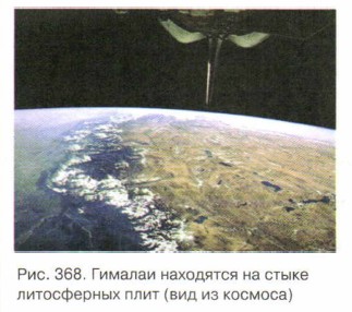Ни у одного другого материка не было такой сложной истории геологического развития, как у Евразии. В отличие от других материков, Евразия состоит не из одной литосферной плиты, а из двух: Евразиатской и Индо-Австралийской. Граница между ними проходит по горному поясу Гималаев {рис. 368). Здесь столкновение литосферных плит привело к образованию гигантской складки на поверхности материка.