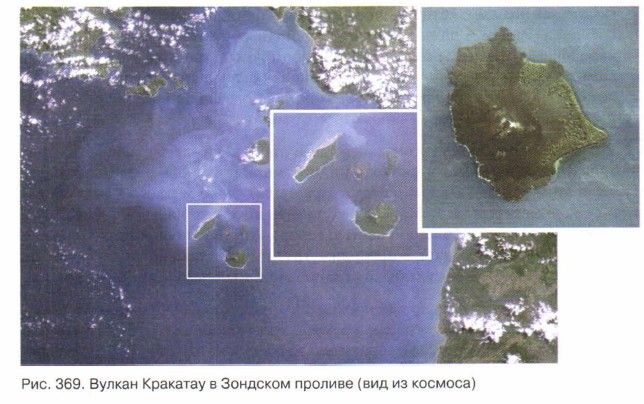 В 1883 г. в пределах этого пояса произошло извержение вулкана Кракатау в Зондском проливе (рис. 369). Считается, что это самое разрушительное за всю историю человечества извержение. Вулканический остров, на котором находился вулкан, просто взорвался! В результате образовалось гигантское цунами, которое, прокатившись по берегам Больших Зондских островов, Индии и даже Восточной Африки, уничтожило все прибрежные населенные пункты. Грохот, раздавшийся при взрыве Кракатау, называют самым громким звуком, который слышала наша планета за все миллиарды лет своего существования. Он был отчетливо слышен в Австралии, на расстоянии нескольких тысяч километров от места взрыва!