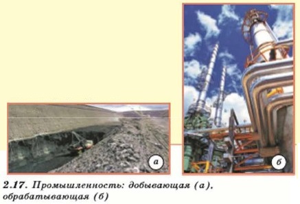 Промышленность подразделяется на добывающую и обрабатывающую. К добывающей промышленности относят добычу различных полезных ископаемых (руд, нефти, угля, газа), заготовку леса, лов рыбы и морского зверя. Очевидно, что её размещение обусловлено расположением добываемых природных богатств. Предприятия обрабатывающей промышленности размещаются по определённым законам в зависимости от того, какую продукцию и как они производят.