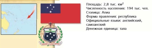 Географическое положение СамоаСамоа — страна Океании. Она расположена в южной части Тихого океана, в Полинезии, на двух крупных и нескольких мелких островах одноимённого архипелага. Острова Самоа — это выступающие над поверхностью океана вершины подводного вулканического хребта, на одном из островов есть действующий вулкан. Берега островов в основном скалистые, сильно изрезанные. Широко распространены коралловые рифы и живописные пляжи.