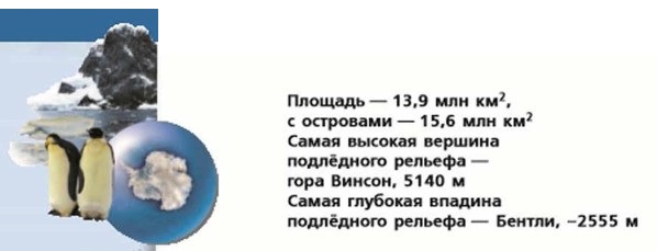 Характер поверхности АнтарктидыУ Антарктиды различают два рельефа: рельеф поверхности ледника и скрытый под ним рельеф земной коры. По высоте ледовой поверхности Антарктида — самый высокий материк. Но геологическому строению и особенностям подлёдного рельефа Антарктиду подразделяют па Восточную и Западную. Границей между ними служат Трансантарктические горы, протягивающиеся почти на 4000 км. Восточная Антарктида — древняя платформа, которая была частью Гондваны. Западная Антарктида — горный складчатый нояс, представляющий собой продолжение Анд. Вершины горных хребтов местами поднимаются над ледником. Землетрясения в Антарктиде редки. Из действующих вулканов крупнейший — Эребус (3794 м).