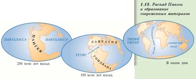 Современные материки и океаныСовременные материки до начала мезозойской эры были частями огромного материка — Пангеи. Она протягивалась в меридиональном направлении от полярных широт Северного полушария до Южного нолюса.
