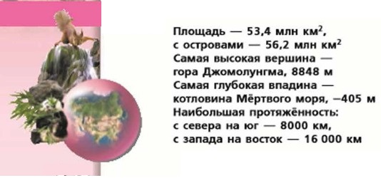 Вы узнаете Вспомните Евразия — величайший материк, ему принадлежит около 1/3 суши планеты. Огромные размеры и сложность строения земной коры создают неповторимые по разнообразию и контрастам природные условия. Географическое положение ЕвразииЮжная оконечность Евразии почти достигает экватора, а северная — лежит далеко за Северным полярным кругом.
