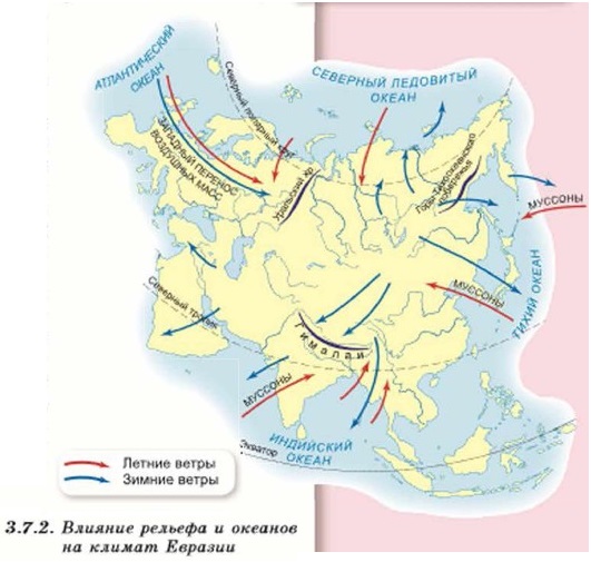 Горы, в отлично от гор других материков, образуют несколько гигантских поясов и занимают такую же площадь, как и равнинные территории древних и молодых платформ. Горы расположены вдоль границ схождения нескольких современных литосферных плит. С запада на восток протягивается относительно молодой Альпийско-Гималайский горный пояс. К нему с севера примыкают возрождённые горы Центральной Азии и юга Сибири. Это самая грандиозная горная страна мира. Здесь сосредоточены наиболее высокие вершины и находится самое высокое нагорье — Тибет. Вдоль восточной окраины материка протягивается второй — Тихоокеанский — пояс гор, включающий и островные дуги с их горным рельефом. Оба горных пояса отличаются частыми разрушительными землетрясениями. В них много действующих (Ключевская Сопка, Кракатау, Везувий, Этна) и потухших (Эльбрус, Казбек, Ичинская Сопка) вулканов. Мои географические исследованияИсследуйте особенности рельефа — Евразии (см. атлас, с. 4-5, 52-53, 62-63). «ПОМОЩНИК» Климат ЕвразииИз-за огромных размеров материка на нём представлены все имеющиеся на Земле климатические пояса и почти все климатические области. Очень велики контрасты температур воздуха между разными широтами и количества осадков между при- океаничсскими и внутрикоитинснталышми районами. Разные части материка находятся под воздействием воздуха, приносимого ветрами с разных океанов. Там, где барьеры гор не ограничивают проникновение воздушных масс в глубь материка, их влияние распространяется на огромные территории. Во внутренних районах Азии господствуют континентальные воздушные массы. Зимой они сильно охлаждаются и образуют область высокого атмосферного давления — Азиатский максимум. В нём ясная и морозная погода (иногда до -50 °С). Сухой и холодный воздух «растекается» из глубинных районов материка, образуя зимние муссоны. Летом над всей прогреваемой Азией господствует низкое давление. С океанов на материк поступают массы влажного морского воздуха — летние муссоны, с которыми связаны обильные ливни.