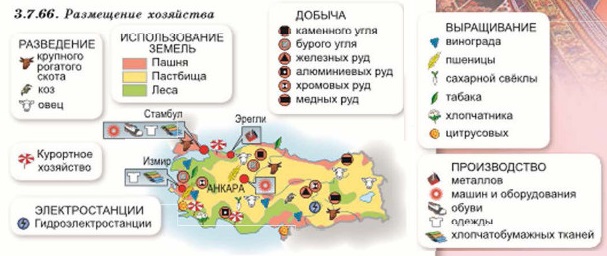 Хозяйственная деятельность ТурцииВ экономике страны сочетаются черты современной промышленности и традиционного сельского хозяйства. В мире страна выделяется добычей хромовой руды, производством тканей, одежды, обуви, а также выращиванием зерновых культур, табака, винограда, цитрусовых. Развит туризм. Болес 3/4 промышленной продукции выпускается в Стамбуле, Измире и близлежащих городах. Активны экономические связи со странами Западной Европы и с Россией. На западе и в центре страны выращивают в основном пшеницу — главную продовольственную культуру. Па орошаемых землях выращивают хлопчатник, табак и сахарную свёклу. Традиционные культуры страны — овощи, орехи (фундук), оливки, цитрусовые. Животноводство наиболее распространено в горных районах, где сосредоточено большое поголовье овец и коз. Овечья шерсть используется для изготовления всемирно известных турецких ковров, а из шерсти ангорских коз получают высококачественный мохер.