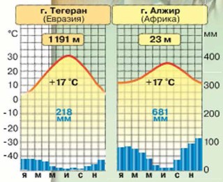 Природа Земли: главные закономерности 6. Климаты ЗемлиВ тропических поясах весь год господствует тропическая воздушная масса. В ней воздух опускается из верхних слоёв тропосферы к земной поверхности. Опускаясь, он нагревается, и даже над океанами не образуется облаков. Преобладает ясная погода, при которой солнечные лучи сильно нагревают поверхность. Поэтому на суше средняя температура воздуха летом выше, чем в экваториальном поясе (до +35 °С). Зимние температуры ниже летних вследствие уменьшения угла падения солнечных лучей. Из-за отсутствия облаков в точение всего года очень мало осадков, поэтому на суше распространены тропические пустыни. Это самые жаркие территории Земли, на которых отмечаются температурные рекорды. Исключение составляют восточные берега материков, которые омываются тёплыми течениями и находятся под действием пассатов, дующих с океанов. Поэтому здесь выпадает много осадков. Территорию субэкваториальных (переходных) поясов летом занимает влажная экваториальная воздушная масса, а зимой — сухая тропическая. Поэтому здесь жаркое и дождливое лето и сухая и тоже жаркая — из-за высокого стояния Солнца — зима. Умеренные климатические поясаУмеренные пояса занимают около 1/4 поверхности Земли. Они имеют более резкие сезонные различия в температуре и осадках, чем жаркие пояса. Это связано со значительным уменьшением величины угла падения солнечных лучей и усложнением атмосферной циркуляции. В них весь год находится воздух умеренных широт, но отмечаются частые вторжения арктического и тропического воздуха. В Южном полушарии господствует океанический умеренный климат с нежарким летом (от +12 до +14 °С), мягкой зимой (от +4 до + 6 °С) и обильными осадками (около 1000 мм в год). В Северном полушарии большие площади занимает материковый умеренный климат Евразии и Северной Америки. Его главная особенность — резко выраженные изменения температуры по сезонам года.