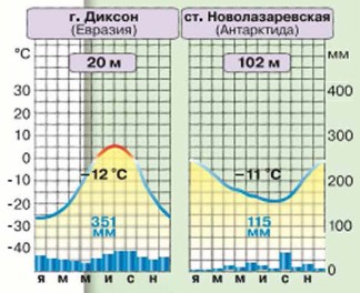 Холодные климатические поясаВ арктическом и антарктическом поясах земная поверхность во время полярного дня получает мало солнечного тепла, а во время полярной ночи нс нагревается совсем. Поэтому арктическая и антарктическая воздушные массы очень холодные и содержат мало водяного пара. Антарктический материковый климат наиболее суровый: исключительно морозная зима и холодное лето с отрицательными температурами. Поэтому Антарктида покрыта мощным ледником. В Северном полушарии похожий климат в Гренландии, а над Северным Ледовитым океаном климат морской арктический. Он теплее антарктического, так как океанские воды, далее покрытые льдами, дают дополнительное тенло.