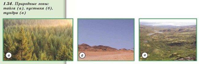 Из-за различий в количестве солнечного тепла и увлажнения внутри географических поясов формируются природные зоны — большие территории с однородными условиями температур и увлажнения, особенностями поверхностных и подземных вод, схожими почвами, растительностью и животным миром.
