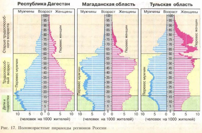 Россияне § 10. Сравниваем половозрастные пирамиды регионов РоссииРассмотрите рисунок 17. Половозрастные пирамиды регионов России построены по данным переписи. Сравните общий вид пирамид: в Дагестане самое широкое основание (значит, там самая большая доля детей). И сужение пирамиды к основанию в Дагестане самое плавное — там рождаемость и была, и остаётся выше, и степень её сокращения была меньше, чем в Магаданской и Тульской областях.