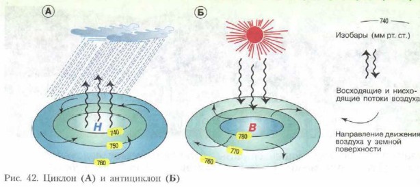 Антициклоны (рис. 42, Б) образуются в областях повышенного давления. В центре антициклона — нисходящие потоки воздуха, значит, воздух не остывает (как в циклоне), а нагревается, удаляется от состояния насыщения. Поэтому в антициклоне стоит сухая, тихая, безоблачная погода. Антициклоны летом, как правило, приносят потепление (земная поверхность нагревается в безоблачную погоду сильнее, чем в пасмурную), а зимой — похолодание (выхолаживание в ясную погоду идёт быстрее). Антициклоны активно действуют зимой в Восточной Сибири, летом и зимой на юге Восточно-Европейской и Западно-Сибирской равнин.