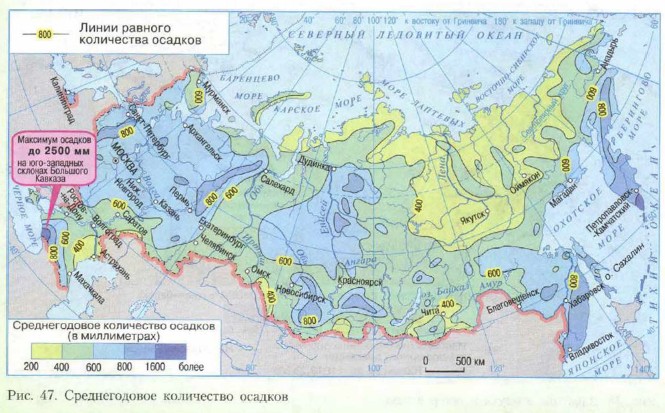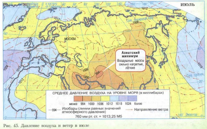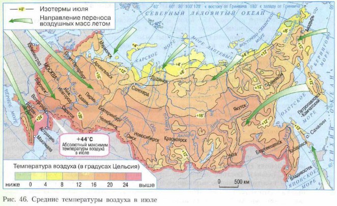 В Сибири летом, как и зимой, господствуют местные воздушные массы, но не холодные, а тёплые, сформировавшиеся над раскалённой солнцем земной поверхностью. Если же сюда доходят массы с Атлантики, то за время пути они успевают прогреться и потерять большую часть влаги и становятся похожи на местные. Карта летних температур (рис. 46) показывает, что их распределение в целом соответствует широте местности. Различия видны лишь в горных районах. Годовое количество осадков в центральных частях Западной Сибири 500—600 мм. Оно уменьшается в северном, восточном и южном направлениях (рис. 47). В горах количество осадков увеличивается.