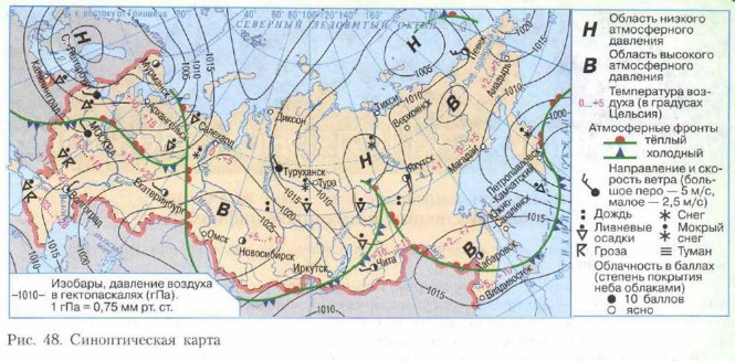 Это я знаю 1. Что влияет на распределение основных элементов климата на территории России? 2. Каковы климатические особенности зимнего сезона? летнего сезона? 3. Где в России самая холодная зима? самая тёплая зима? 4. Как распределяется количество осадков по территории России? 5. Объясните увеличение суммы осадков в горных районах. Откуда воздушные массы приносят осадки, выпадающие на Урале? на Алтае? в Сихотэ-Алине? Это я могу 6. Определите по картам (см. рис. 44 и 46), в каких районах нашей страны наблюдаются самые низкие и самые высокие температуры воздуха летом и зимой. Объясните их причины. 7. Определите по карте (см. рис. 47) среднегодовое количество осадков для средней полосы Восточно-Европейской равнины, Прикаспийской низменности, побережья Восточно-Сибирского моря, побережья Японского моря. Где и почему выпадает максимум и минимум осадков? 8. Проанализируйте синоптическую карту (рис. 48) и выясните, что на ней изображено с помощью условных знаков.
