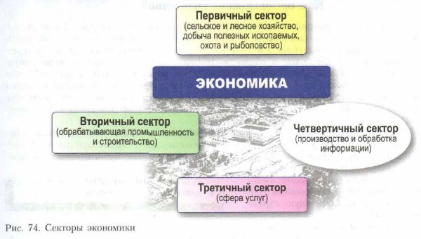 Хозяйство России Развитие хозяйства РоссииЭтапы исторического развития хозяйства отражают первичный, вторичный, третичный секторы экономики (рис. 74). Первичный и вторичный сектора включают отрасли производственной сферы, третичный — нематериальные услуги непроизводственной сферы.