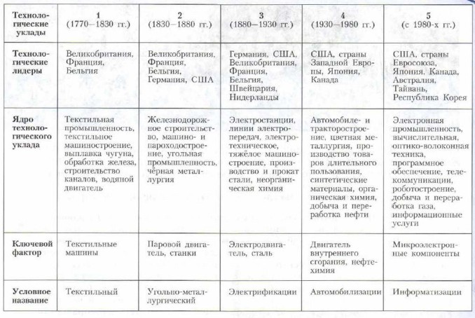 «Циклы Кондратьева»Экономисты выделяют в промышленности исторические этапы, названные технологическими укладами или «циклами Кондратьева». Русский учёный Н.Д. Кондратьев доказал, что развитие экономики происходит нс в виде прямолинейного роста, а поэтапно — циклами, блоками. Выделение циклов связано с тем, что структура промышленности не остаётся неизменной. То одна, то другая отрасль выходит на первый план и тянет за собой все остальные отрасли. Ведущие отрасли промышленности определяют технический уровень развития хозяйства страны, способность её к самостоятельному развитию. Отрасли каждого предыдущего цикла, даже будучи очень развитыми, рано или поздно вступают в полосу кризиса: они вынуждены сокращать производство, менять его технологию или переносить его в другие районы (из Западной Европы к развивающиеся страны). К примеру, текстильные и угольно-металлургические районы Западной Европы уже прошли через полосу кризиса и перестроили своё производство с переориентацией на другие отрасли.