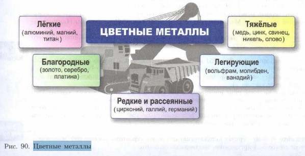 Хозяйство России § 46. Цветная металлургия РоссииКаковы особенности цветной металлургии. Каковы особенности размещения предприятий цветной металлургии. Каковы особенности цветной металлургии?Цветные металлы (рис. 90) незаменимы во многих отраслях промышленности, в частности, в оборонной, авиационной, ракетно-космической. Легирующие металлы, например, необходимы в качестве добавок для производства особых марок стали и уникальных сплавов. Так. вольфрам делает сталь более твёрдой, молибден жаропрочной, ванадий — устойчивой к толчкам и вибрации.