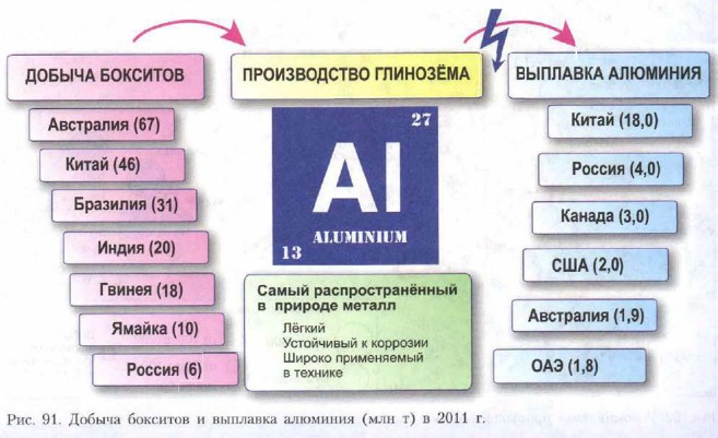 Каковы особенности размещения предприятий цветной металлургии?Предприятия цветной металлургии, как правило, размещаются вблизи районов добычи сырья. В местах добычи осуществляется и обогащение руд. У источников дешёвой энергии сосредотачиваются заводы но выплавке лёгких металлов. Исторически первым районом цветной металлургии в России был Урал (почему?). Сейчас производство цветных металлов развито также в Сибири (крупнейшие предприятия), на Дальнем Востоке и в европейской части страны. Никель-кобальтовые руды перерабатываются в местах добычи, поскольку содержание металлов в них невелико. Кроме Норильска, образовался центр этих производств па Кольском полуострове: Мончегорск близ горного массива Хибины, Заполярный (рядом с которым находится посёлок с характерным названием Никель). В меньших масштабах добывается руда на Урале. Алюминий наиболее широко применяемый в технике среди цветных металлов. В алюминиевой промышленности технологический процесс состоит из двух основных стадий: производства глинозёма — оксида алюминия (из бокситов или нефелинов) и производства металлического алюминия. Для получения 1 т глинозёма необходимо переработать либо 2—3 т бокситов и 1 т известняка, либо 4—6 т нефелинов и 9—12 т известняка. Поэтому глинозёмные заводы в своём размещении тяготеют к месторождениям алюминиевых руд. Получение металлического алюминия из глинозёма требует больших затрат электроэнергии, поэтому крупнейшие центры по выплавке алюминия находятся вблизи ГЭС. Именно за счёт обладания огромными гидроэнергоресурсами Россия находится на 2-м месте в мире по выплавке алюминия, хотя глинозёмом обеспечена примерно на треть (рис. 91).