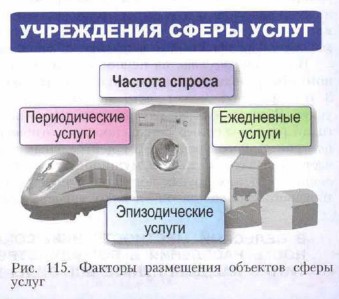 Размещение учреждений определяется прежде всего частотой спроса (рис. 115). Ежедневно нам необходимы услуги продуктовой торговли (покупка молока, хлеба), детских садов, школ, пассажирского транспорта, жилищно-коммунального хозяйства. Эпизодические услуги, необходимые нерегулярно (несколько раз в год и реже), — покупка и ремонт предметов длительного пользования, посещение театров и музеев, туристические поездки. Промежуточное положение занимают периодические услуги: покупка многих продуктов питания (несколько раз в месяц), посещение парикмахерских, прачечных, кинотеатров. Понятно, что, чем выше частота спроса, тем ближе к населению должны быть места предоставления услуг. Причём «ближе» здесь вовсе не означает обязательно близость к месту жительства зто может быть близость и к месту работы, и к месту ежедневных передвижений населения (вблизи остановок общественного транспорта, в местах пересадок). А главное для услуг эпизодических качество обслуживания: для выбора телевизора или для консультации с врачом каждый предпочтёт обратиться в специализированное, оснащённое по последнему слову техники учреждение с наиболее квалифицированным персоналом, даже если оно и расположено довольно далеко.