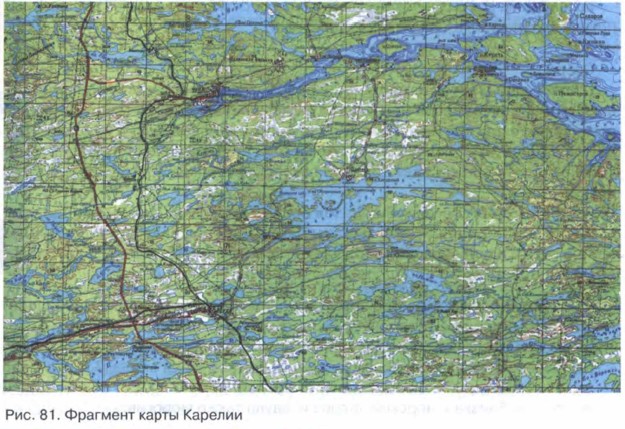 Почему Каспийское море называют озером? Море — это часть Мирового океана. Озеро же — замкнутый водоём, не имеющий прямой связи с океаном. Следовательно, Каспий — озеро, ведь нет пролива, который бы соединял его с океаном. А почему же тогда его называют морем? Потому что это очень большой водоём, потому что вода в нём не просто солёная, но и по составу близка к морской, флора и фауна также морские. Самое глубокое озеро мира — Байкал — также находится в России. Занимающий огромную трещину в земной коре, Байкал имеет глубину 1642 м. Это глубже многих морей. Озёра распределены по территории страны неравномерно. Это связано с разнообразием геологического строения и климата нашей страны. Наибольшее число озёр расположено в зоне избыточного увлажнения на севере России. «Озёрным краем», «страной тысячи озёр» называют в нашей стране Карелию, в которой находится огромное число небольших и очень чистых озёр. Их так много, что в некоторых районах площадь поверхности воды значительно больше, чем площадь суши (рис. 81).