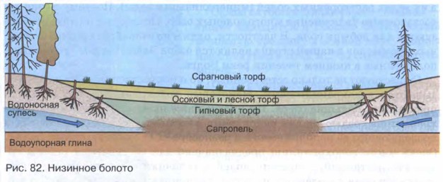 К югу количество озёр заметно убывает. Одновременно возрастает содержание в их водах растворённых солей (минерализация воды). Поэтому в зоне недостаточного увлажнения много солёных озёр. Некоторые из них используются для добычи соли. В частности, одним из старейших районов соляных промыслов в нашей стране являются озёра Эльтон и Баскунчак, расположенные в нижнем течении реки Волги. Существуют не только естественные, но и искусственные озёра. Они называются водохранилищами. Некоторые водохранилища по площади превосходят большие озёра. Их иногда даже называют «морями». Водохранилища создаются для накопления в них воды в период половодья и последующего её использования в разнообразных хозяйственных целях. Очень много водохранилищ предназначено для обеспечения работы гидроэлектростанций, орошения полей в условиях засушливого климата, водоснабжения населённых пунктов, предупреждения наводнений и т.п. Одновременно существуют и негативные последствия создания водохранилищ. Например, Волга превратилась в почти непрерывную цепочку водохранилищ. В зоне затопления оказались плодородные земли и населённые пункты. Берега водохранилищ быстро разрушаются, создавая угрозу для социальных и производственных объектов. По берегам искусственных озёр наблюдается подтопление местности, изменяется микроклимат. Болота РоссииБолото — это избыточно увлажнённый участок суши с влаголюбивой растительностью. Болота в России занимают около 1 млн км2. Это составляет почти 5,9% площади страны. Болота распространены в зонах избыточного увлажнения и в зонах распространения многолетней мерзлоты. Они возникают в результате зарастания мелких озёр, переувлажнения земной поверхности при большом количестве осадков, малом испарении и замедленном стоке воды. Существуют два типа болот — болота низинные (с плоской или вогнутой формой поверхности) и болота верховые (с выпуклой формой поверхности). В низинных болотах избыточное увлажнение возникает вследствие близкого расположения подземных вод к поверхности земли (рис. 82). В этих условиях господствует растительность, приспособленная к избытку влаги и минеральных веществ. На низинных болотах растут осока, тростник, зеленые мхи. Иногда здесь растут леса из ольхи и берёзы. Эти болота проходимы, хотя могут быть и опасными, особенно возникшие на месте зарастающих озёр.