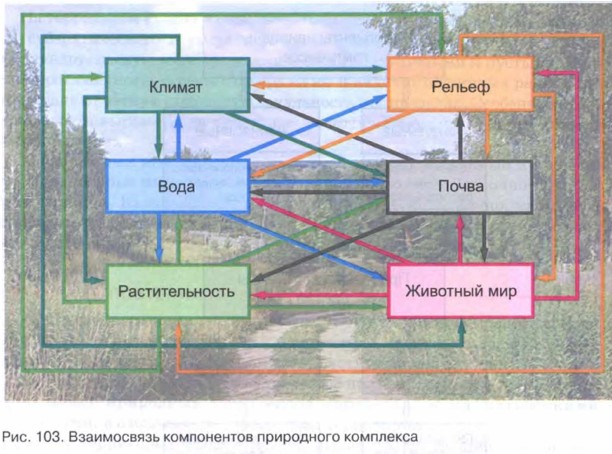 Природные зоны России § 25. Природные комплексы РоссииВспомните Какие природно-территориальные комплексы вы знаете? Природно-территориальный комплексТретий год вы изучаете географию, и третий год в учебниках географии вы находите параграф с таким названием: «Природный комплекс». Это не повторение одного и того же. Природный комплекс — понятие настолько ёмкое, что каждый раз найдётся что-то новое, что можно о нём сказать. В шестом классе вы просто узнали, что это такое. В седьмом — подробно изучили природные комплексы, которые можно встретить на разных материках. Что же будет в этом году? Сейчас мы об этом поговорим, но начнём с определения. Природный комплекс (природно-территориальный комплекс, ПТК) — территория, в пределах которой существует определённое закономерное сочетание взаимосвязанных компонентов. Этими компонентами являются: климат, рельеф, горные породы, поверхностные и подземные воды, растительность, животный мир. Их сочетание делает каждый ландшафт, каждый пейзаж планеты неповторимым. Природные компоненты связаны между собой на основе взаимного влияния друг на друга (рис. 103). Иногда это влияние очевидно. Так, климат вполне понятным образом влияет на характер растительности, а та, в свою очередь, во мнох ом определяет тип почвы. Рельеф является важным климатообразующим фактором, но и сам изменяется силами выветривания, которые связаны с климатическими процессами. В других случаях определить, в чём заключается это влияние, труднее. Например, установить влияние животных на почву или рельеф не так просто. Но оно есть. Попробуйте сами его объяснить.