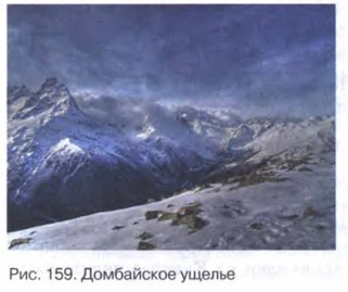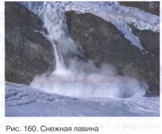 В протерозое (более 570 млн лет назад) на месте Кавказа располагался морской бассейн. В дальнейшем эта территория поднималась вдоль границы столкновения литосферных плит. В результате на месте современного Большого Кавказа в палеогене возникли покрытые тропической растительностью острова. В неогене они слились в единый горный массив, который отделил Каспийское море от Мирового океана. В ледниковый период тропическая растительность сменилась хвойными и смешанными лесами. Подъём земной поверхности в четвертичном периоде привёл к формированию гор, вершины которых поднялись выше уровня снеговой линии. Это привело к появлению в горах ледников. В ледниковую эпоху площадь горного оледенения значительно увеличилась. Языки ледников располагались гораздо ниже их современного положения. На это указывают многочисленные моренные гряды, сохранившиеся от древних ледников. В настоящее время Кавказ — главный центр горного оледенения в нашей стране. В связи с обильными снегопадами на склонах гор часто сходят лавины, создающие угрозу для населения, социальных и производственных объектов, дорог и т.п. (рис. 160).