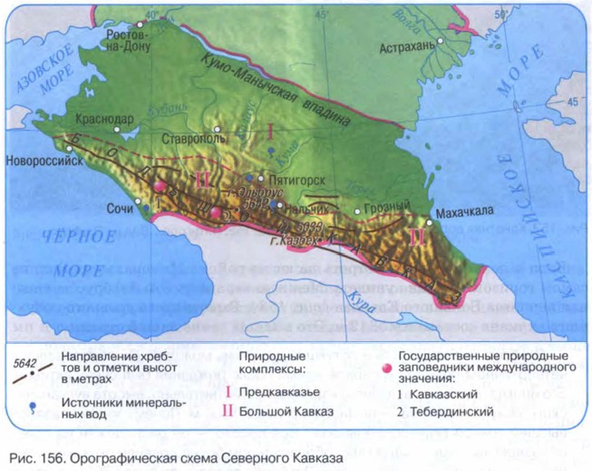 В пределах России находится лишь небольшая часть Кавказа (рис. 155 ). В пределах нашей страны лежит лишь северный склон Большого Кавказа — Северный Кавказ (рис. 156) и Предкавказье.