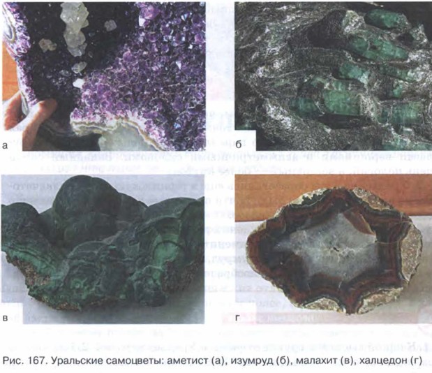 Полезные ископаемые УралаВ результате длительных процессов разрушения на поверхности оказались слои горных пород, которые содержат разнообразные полезные ископаемые. Эти слои образовались во время герцин- ской складчатости и первоначально находились на большой глубине. Поэтому в центральной и восточной части Уральских гор расположены крупные месторождения платины, золота, железа, меди, а также залежи знаменитых уральских самоцветов: изумруда, топаза, аметиста, малахита и др. (рис. 167).