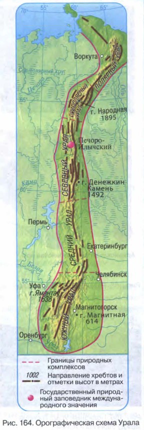 Урал § 37. Геологическое строение, рельеф и полезные ископаемые Урала«Урал» в переводе с тюркского означает «пояс». В старые времена Урал так и называли — Каменный пояс. Этот «пояс» разделяет две огромные равнины — Восточно-Европейскую и Западно-Сибирскую. У Северного полярного круга ширина горного пояса достигает 50 км, а на юге, у города Магнитогорска — 150 км. По Уральским горам проходит граница между Европой и Азией. Район представляет собой единую протяжённую горную систему, сформировавшуюся в период герцинской складчатости. Барьерное положение Урала относительно западного переноса воздушных масс вызвало различия климата западного и восточного его склонов. По разнообразию природных зон Урал подобен Восточно-Европейской равнине, но границы высотных почвенно-растительных поясов смещены к югу. Из-за небольшой высоты гор вертикальная поясность выражена слабо. Вспомните В какую эпоху складчатости образовались Уральские горы? Рельеф и геологическое строение УралаУральские горы значительно ниже других гор России. Максимальная высота гор достигает 1895 м (гора На́родная). Интересно, что ударение в этом названии стоит не на втором слоге — Нарбдная, а на первом — Народная. Корни этого названия не связаны со словом «народ». Оно происходит от слова «на́ро», что в переводе с языка живущих здесь ненцев означает «дремучий лес». Высота наиболее низких перевалов, через которые проложены дороги, составляет не более 500 м. Пассажиры поездов могут даже не заметить, что они перевалили через Уральские горы и попали из европейской части страны в азиатскую, поскольку перепад высот незначителен, а рельеф почти не отличается от равнинного. Урал представляет собой систему из параллельных плосковершинных хребтов, разделённых продольными и поперечными долинами (рис. 164 ). Уральские горы имеют асимметричное строение. Западный склон гор пологий, плавно переходящий в Восточно-Европейскую равнину. Центральная часть гор узка и имеет наибольшие высоты. Восточные склоны гор более крутые, местами они уступом высотой 100-200 м обрываются к Западно-Сибирской равнине.