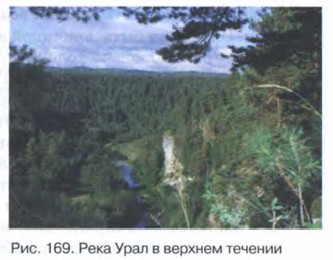 Гидрография УралаУральские горы служат водоразделом для рек европейской территории страны и Западной Сибири. На западных склонах этих гор находится исток Печоры. Здесь же берут начало крупные притоки Камы. На восточных склонах гор расположены истоки многочисленных притоков Оби и берёт начало река Урал (рис. 169). Главный водораздел сдвинут к востоку, поэтому реки западного склона длиннее. Для них характерно чередование участков со спокойным плавным течением и бурных порожистых отрезков, на которых реки прорываются через узкие глубокие ущелья, заложенные по крупным разломам.
