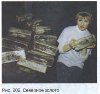 Полезные ископаемые Северо-Восточной СибириНедра этого района нашей страны изучены ещё недостаточно. Как и в Средней Сибири, все известные месторождения располагаются в долинах рек. Осадочные породы Северо-Восточной Сибири содержат каменный уголь, а с магматическими горными породами связаны месторождения различных руд. В недавнем прошлом район был лидером по добыче золота. Здесь также находится главный оловоносный бассейн страны. Месторождения олова образуют цепь на восточном побережье Евразии, которая протянулась на многие тысячи километров через территорию России, Китая, Таиланда, Малайзии и Индонезии. А начало этого гигантского «оловянного пояса» находится на полуострове Чукотка, где первые месторождения оловянных руд открыты почти 50 лет назад. Это было во многом случайное и неожиданное открытие. Ведь до этого считалось, что олово и золото в месторождениях несовместимы: если где-то есть месторождения олова, то золото в этих краях искать бесполезно, и наоборот. Но оказалось, что эти два вида полезных ископаемых могут соседствовать (рис. 202).