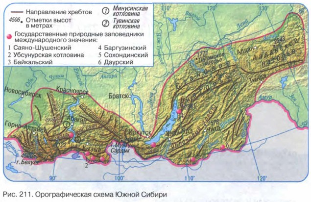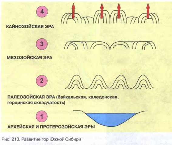 Горы Южной Сибири § 47. Геологическое строение и рельеф гор Южной СибириПояс гор Южной Сибири протянулся с запада на восток более чем на 4500 км. В его состав входят Алтай, Восточный и Западный Саян, горы и нагорья Прибайкалья и Забайкалья. Район находится в самом центре Азии и отделяет Западно-Сибирскую равнину и Среднесибирское плоскогорье от внутренних полупустынных и пустынных плоскогорий и нагорий Центральной Азии. Для этого региона характерны средневысотные и высокие складчато-глыбовые горы палеозойского возраста, разделённые большими и малыми котловинами. В её пределах круглогодично господствуют континентальные воздушные массы. В горах Южной Сибири хорошо выражена высотная поясность. Горно-таёжные леса и горные тундры на склонах хребтов сочетаются с участками лесостепи и степи в больших межгорных котловинах. Вспомните на какую геологическую эру приходится эпоха байкальской складчатости? Какие горы называют возрождёнными? История геологического развития гор Южной СибириБайкальское нагорье начало формироваться в эпоху байкальской складчатости (рис. 210). Несколько позже, во время каледонской складчатости, образовались Саяны, восточная часть Алтая и Кузнецкий Алатау. В дальнейшем по разломам произошло опускание ряда участков нагорья. Так возникли крупные межгорные впадины — Кузнецкая, Минусинская и Тувинская. В конце палеозоя образовались горы Западного и Южного Алтая, восточная часть Байкальского нагорья. После этого Южная Сибирь полностью стала сушей. Эта гористая суша постепенно (вплоть до неогена) разрушалась под влиянием процессов выветривания. В результате на месте древних гор возникла приподнятая равнина.