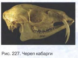 Горы Южной Сибири Высотная поясность гор Южной СибириКлимат горных тундр суров, поэтому состав растительности существенно обеднён. Это, в свою очередь, влияет на животный мир высотного пояса. Здесь выживают наиболее неприхотливые животные. В горных лесах обитает удивительное животное — кабарга. Она напоминает маленького безрогого оленя. А что удивительного в кабарге? Рогов у кабарги действительно нет, но зато у взрослых самцов вырастают клыки. Да какие! Они длинные (почти 10 см) и выдаются изо рта в виде направленных вниз и несколько согнутых назад бивней (рис. 227).