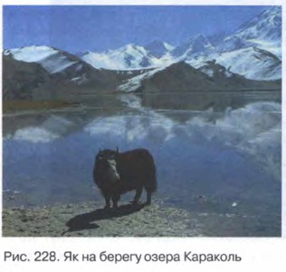 Алтай — единственный в нашей стране район разведения яков. Родина этих огромных, покрытых густой длинной шерстью быков — высокогорья Тибета. Это сильное, выносливое животное прекрасно переносит нехватку воды и кислорода. Его используют как вьючное животное для перевозки грузов (рис. 228).