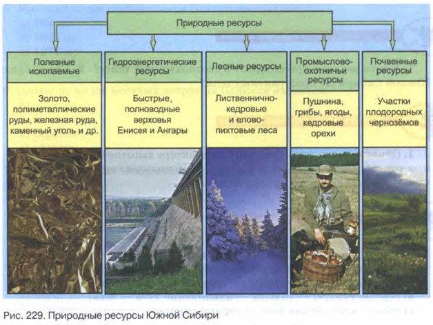 Природа и человек гор Южной СибириГоры Южной Сибири богаты различными природными ресурсами (рис. 229). Наибольшее значение имеют минеральные ресурсы. Суровый климат, сильно расчленённый рельеф, многолетняя мерзлота и слабая заселённость территории ограничивают возможность использования ресурсов. Казалось бы, в таких красивых и не тронутых человеком местах не должно быть никаких проблем, связанных с хозяйственной деятельностью. Но они есть. Более 30 лет назад, несмотря на протесты учёных, на берегу Байкала был построен комбинат, производящий бумагу. Сточные воды этого комбината поступают в Байкал, загрязняя его. Это сказывается на качестве воды и условиях жизни обитателей Байкала, привыкших к чистейшей воде. Происходит сокращение численности некоторых животных, в том числе и байкальских эндемиков: нерпы и омуля. Конечно, говорить о том, что положение катастрофическое, ещё рано: глубочайшее озеро планеты обладает большой способностью к самоочистке, да и объём воды в Байкале огромен. Тем не менее 50 млн м3 загрязнённых сточных вод ежегодно поступают в озеро. Среди учёных уже возникло мнение, что Байкал перестал быть эталоном чистоты воды.