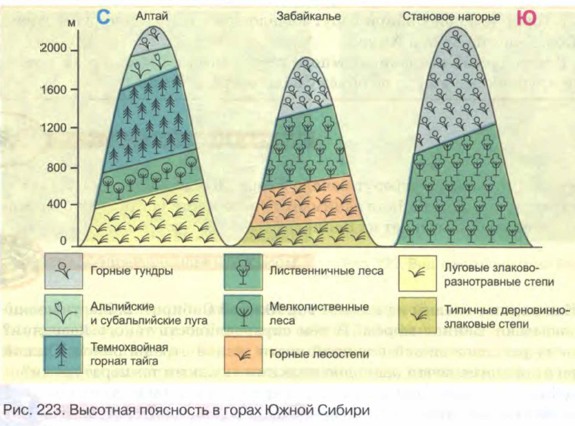 Горы Южной Сибири § 49. Высотная поясность гор Южной СибириВспомните в каких горах России наблюдается наибольшее число высотных поясов? От чего оно зависит? Южная Сибирь — горный район, где широтная зональность сменяется высотной поясностью (рис. 223).