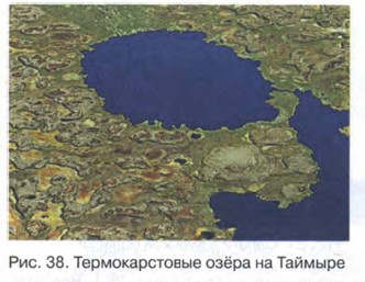 Геологическое строение и рельеф России Общие черты рельефа РоссииНа открытых пустынных и полупустынных пространствах Прикаспийской низменности главным разрушителем и созидателем является ветер. Здесь формируются песчаные холмы разной формы: барханы и дюны. В северных и восточных частях страны, где климат особенно суров, облик поверхности во многом определяется процессами, протекающими в толще многолетне-мёрзлых пород. При протаивании мёрзлых слоёв формируются многочисленные неглубокие понижения, в которых скапливается вода, — так появляются термокарстовые озёра (рис. 38). При замерзании воды её объём увеличивается, и на ровной поверхности возникают бугры пучения. Такие и многие другие мерзлотные формы рельефа широко распространены на сибирских низменностях, в Средней и Северо-Восточной Сибири.