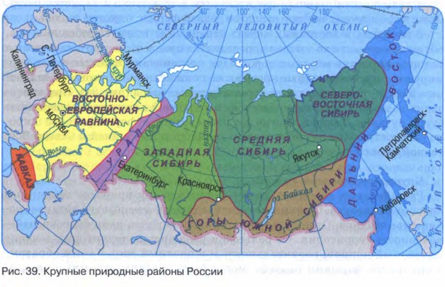 Крупные природные районы РоссииРельеф играет огромную роль в формировании природно-территори- .gj ального комплекса. Он влияет на распределение температур воздуха, количества осадков. От него же зависит характер рек, наличие озёр, заболоченность территории. От рельефа и увлажнения территории зависят почвенный покров, растительность и животный мир. Таким образом, с крупными формами рельефа могут быть связаны огромные по площади природно-территориальные комплексы (ПТК). Подобные ПТК называют крупными природными районами. Внутри их можно выделять более мелкие ПТК. На территории России выделяется восемь таких крупных природных районов (рис. 39). Все они будут нами подробно изучены позже. Пока же назовём их. Почти всю европейскую часть страны занимает огромная Восточно-Европейская, или Русская, равнина. С юга её ограничивает Кавказ — высочайшие горы нашей страны. Урал, ограничивающий Русскую равнину с востока, — горы хоть и невысокие, но их природа отличается от природы равнины.
