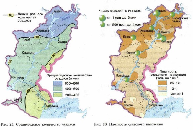Поволжье § 34. Поволжье: хозяйство и проблемыКак природные условия влияют на сельское хозяйство Поволжья. Какова современная ситуация в хозяйстве Поволжья. Какие проблемы обострились в постсоветский период. Как природные условия влияют на сельское хозяйство Поволжья?Сельское хозяйство долгое время оставалось основой экономики Поволжья, потому что его агроклиматические ресурсы весьма благоприятны для выращивания зерновых и технических культур, почвы плодородны, продукцию реализовывать выгодно благодаря географическому положению. Даже после смены аграрной специализации на промышленную сельское хозяйство в районе сохранило важнейшую роль. Сохранило оно и две свои отличительные черты. Во-первых, в сильно вытянутом в меридиональном направлении районе сменяются несколько природных зон, а сухость климата возрастает с северо-запада на юго-восток. Северная часть района, особенно высокий правый берег, похожа на Центральное Черноземье: зерновое хозяйство (главным образом, пшеница, как озимая, так и яровая), посевы сахарной свеклы и конопли, мясо-молочное скотоводство и свиноводство. В Саратовской и Волгоградской областях уже почти нет сахарной свеклы, появляются подсолнечник и горчица, молочное направление меняется на мясное. В Заволжье — на левом берегу Саратовской и Волгоградской областей — зерновые культуры, мясное скотоводство и овцеводство. На юге, в Волго-Ахтубинской пойме, выращивают овощи и бахчевые, а также фрукты и рис. На сухостепных и полупустынных пастбищах на границе с Казахстаном и в Калмыкии разводят овец и верблюдов. Во-вторых, устойчивость сельского хозяйства нарушается засушливостью климата на большой территории. В Нижнем Поволжье необходимо орошение. Для Заволжья характерна антициклональная погода, которая летом вызывает засухи. Они особенно опасны, если сопровождаются горячими и пыльными юго-восточными ветрами (суховеями) или пыльными бурями. В этих случаях либо зерновые могут совсем погибнуть, либо зерно в них засыхает. На протяжении XX в. дважды засухи в Поволжье сопровождались страшным голодом: в 1921 г. и 1933—1934 гг. Каждый раз ущерб от стихии усугублялся социальными факторами. В первом случае подвоз продовольствия осложнялся разрухой на транспорте (в Сибири хлеб имелся, но его невозможно было быстро вывезти оттуда). Во втором случае голод был многократно усилен тем, что запасы зерна у крестьян изымались «на государственные нужды» (в том числе на экспорт, для оплаты закупаемого промышленного оборудования: именно за счет крестьянства проводилась индустриализация российской экономики). Как связано количество осадков с плотностью сельского населения?1. Почему количество осадков уменьшается с северо-запада на юго-восток? 2. Где больше осадков — на Правобережье или в Заволжье? Почему? 3. В чем различия специализации сельского хозяйства северо-западных и юго- восточных районов? 4. Какие сельскохозяйственные культуры и отрасли требуют бо́льших, а какие меньших затрат труда? В каких районах Поволжья требуется больше сельскохозяйственного населения? 5. Какие территории Поволжья были заселены раньше, какие — позже? Сказалось ли это на плотности населения?