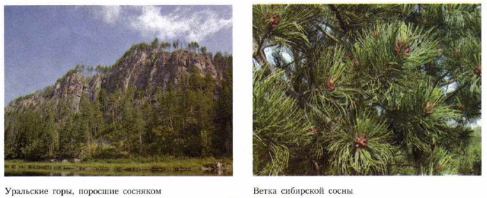 Регионы России Горный каркас России — Урал и горы Южной СибириКакая отличительная черта природы характерна для обоих регионов?Бо́льшая часть Урала и вся Южная Сибирь располагаются в умеренном климатическом поясе, но имеют разный климат. В соответствии с климатическими условиями распределяются и природные зоны в предгорьях и на нижних участках горных склонов. Вытянутость Уральских гор вдоль меридиана обусловливает большой набор природных зон в предгорьях. Через Урат к Западно-Сибирской равнине, но существу, протягиваются те зоны, которые пересекают субширотно соседнюю Восточно- Европейскую равнину в ее восточной части. В пределах Урала эти зоны отклоняются южнее из-за охлаждающего влияния более значительных абсолютных высот. С севера на юг полярные пустыни Новой Земли и тундра Пай-Хоя последовательно сменяются тайгой, смешанными (преимущественно мелколиственными) лесами — вплоть до луговых и сухих степей Южного Урала. Наибольшие площади расположены в умеренном климате и заняты таежными лесами. Причем в Предуралье господствует елово-пихтовая тайга, а в Зауралье к этим хвойным породам добавляется сибирский кедр, знаменитый своими кедровыми орешками (правильное название этого могущего дерева — сибирская сосна).