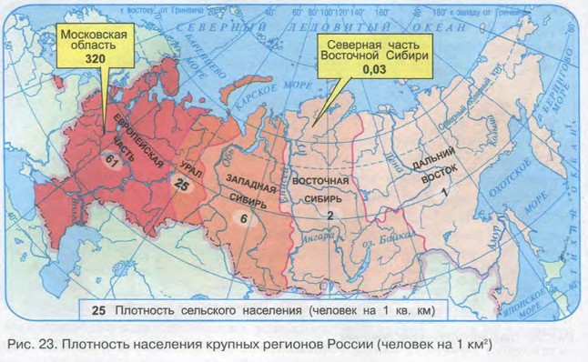 Население России Размещение населения РоссииНаиболее густо заселён Центральный район страны. Здесь плотность населения превышает 60 человек на 1 км2. При этом в отдельных его частях (например, в Московской области) плотность населения достигает более 330 человек на 1 км2. Для нашей страны это максимальная величина плотности населения. Достаточно большая плотность населения (около 40 человек на 1 км2) характерна для многих районов Европейской России. Она близка к плотности населения большинства стран Европы. К северу от основной зоны расселения России расположена зона Севера. По характеристикам населения она прямо противоположна главной полосе расселения. Плотность населения здесь крайне мала — меньше 1 человека на 1 км2. Причём это население в основном проживает в долинах рек, в районах освоения крупных месторождений полезных ископаемых, в населённых пунктах, расположенных вдоль транспортных магистралей. В других районах этой зоны население может вообще отсутствовать. Городов в зоне Севера очень мало, а крупных городов — ещё меньше. Отсутствие большого населения в этой зоне препятствует освоению разнообразных и богатых природных ресурсов. Наименее заселены районы Сибири и Дальнего Востока страны, бо́льшая часть которых входит в пределы северной зоны расселения (рис. 23). Рекордно мала плотность населения (около 0,1 человека на 1 км2) в Республике Саха (Якутия).