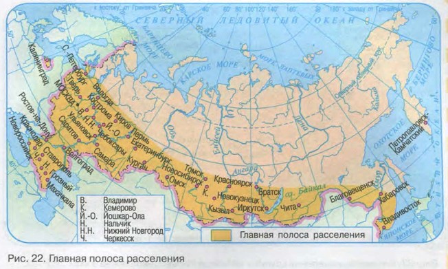 Две зоны расселения РоссииВ зависимости от характера природных условий в России сложились две зоны, отличающиеся по заселённости и хозяйственной освоенности: основная и северная. Из этих названий следует, что основная зона расселения (или главная полоса расселения) занимает южную часть территории страны. В действительности в пределах европейской территории России она сильно смещена к северу, занимая почти всю её площадь за исключением самых северных районов (рис. 22). Северная граница основной зоны расселения располагается примерно вдоль линии Санкт-Петербург — Петрозаводск — Пермь — Новосибирск — Красноярск. К востоку от Красноярска она тянется узкой полосой вдоль Транссибирской магистрали1 . В природном отношении главная полоса расселения совпадает с границами степной и лесостепной зон, а также районов южной тайги смешанных и широколиственных лесов. Климат, рельеф и почвенные условия этой территории благоприятны для проживания и ведения сельского хозяйства. Не нужно забывать и про то, что именно европейские районы страны, и особенно Центральный, являются историческим ядром России. Основная зона расселения занимает всего треть территории страны, но в её пределах проживает более 90% населения. Теперь становится понятным, почему эта зона расселения называется основной. Плотность населения здесь существенно выше средней по стране и составляет около 50 человек на 1 км2. Кстати, это не так уж и много — такая плотность приблизительно равна среднемировой. В главной полосе расселения находятся все крупнейшие города страны, производится большая часть промышленной и сельскохозяйственной продукции. 1 Транссибирская магистраль — железная дорога от Челябинска до Владивостока. Её длина около 7 тыс. км. Дорога строилась с 1891 по 1916 г. и связала западную и восточную части страны.
