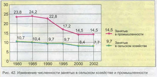 Население России Трудовые ресурсы и рынок труда РоссииРоссия обладает значительными и высококвалифицированными трудовыми ресурсами. Больше половины трудоспособного населения России работает в отраслях промышленности, строительства, сельского хозяйства, на транспорте. Доля занятых в отраслях нематериальной сферы (торговля, общественное питание, финансовая деятельность и др.) в последние годы возросла и составляет 48%. Эти цифры существенно отличаются от показателей, характерных для многих экономически развитых стран мира. Например, в США, Канаде, Германии, Великобритании, Франции, Японии, Швеции большая часть населения занята в отраслях нематериальной сферы. Население нашей страны, работающее в сфере материального производства, весьма неравномерно распределено между его отраслями (рис. 42 и 43).
