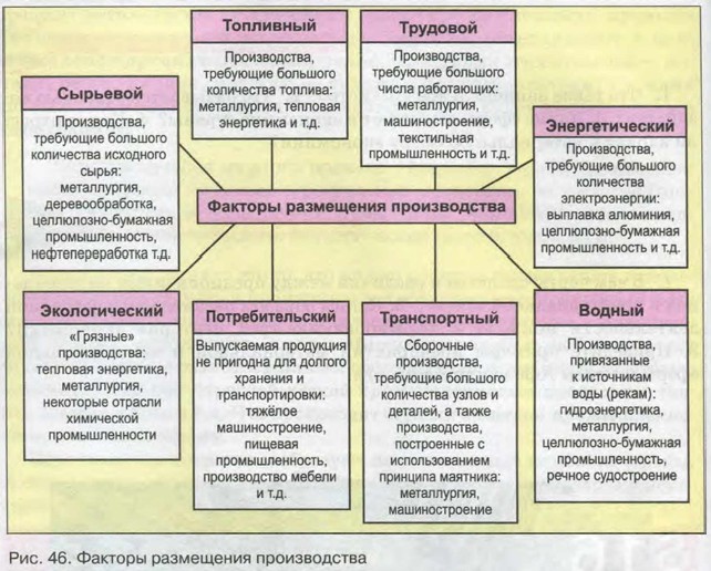 Хозяйство России § 16. Факторы размещения производства РоссииВспомните Какие производства называют «грязными»? Помните, в самом начале учебного года мы рассматривали пример формирования нового хозяйственного района? Тогда мы пришли к мысли о том, что производство не может возникнуть на пустом месте. Для этого необходимы некоторые условия. Условия, определяющие возможность возникновения и развития той или иной отрасли хозяйства на конкретной территории, называются факторами размещения производства (рис. 46). Для каждой отрасли характерен особый набор факторов размещения.