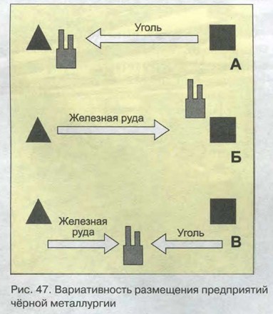 Сырьевой и ресурсный факторы РоссииЕсли работа предприятия связана с переработкой большого количества исходного сырья, то наиболее целесообразным может быть его строительство рядом с источником этого сырья. Так проявляется влияние сырьевого фактора размещения производства. Например, для работы металлургического завода необходимо огромное количество руды. Но для выплавки металла нужен ещё и уголь, причём немало. Поэтому металлургические производства имеет смысл размещать и в районах угледобычи. В этом случае учитывается действие топливного фактора (рис. 47).