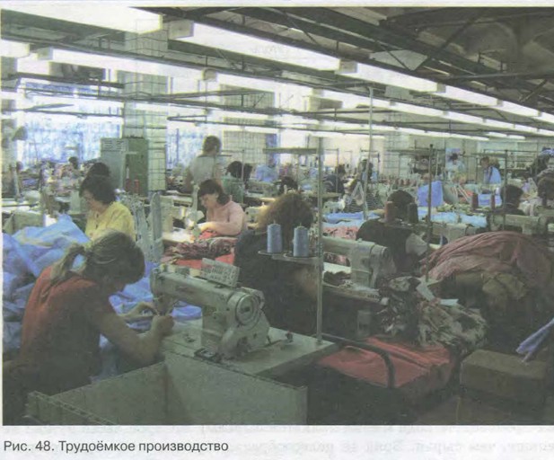 Многие заводы и фабрики используют в своём производстве воду (для транспортировки, мойки, охлаждения оборудования, а в ряде химических производств вода и сама является сырьём), которой часто нужно не меньше, чем сырья. Вряд ли целесообразно строить такие предприятия в засушливых районах, где нет крупных рек и озёр. Проще их сразу размещать на берегах водоёмов. В таком случае говорят о влиянии на размещение предприятий водного фактора. Различные производства потребляют разное количество электроэнергии. Для каждого производства нужна электроэнергия, но здесь речь идёт не об освещении цехов и электропитании станков, а о том, что есть производственные процессы, которые нельзя осуществить без затрат огромного количества электроэнергии. Например, выплавка алюминия происходит в электропечах специальной конструкции, которые требуют столько же электричества, сколько средних размеров город. Конечно, по линиям электропередачи электричество можно доставить на весьма значительные расстояния. Но эти линии ещё нужно построить, а при передаче энергии неизбежны потери, поэтому с технической и экономической точки зрения проще и выгоднее размещать энергоёмкие производства рядом с электростанциями. Таким образом, имеется и энергетический фактор размещения производства. Факторы трудовых ресурсов и потребителейНа любом предприятии работают люди, но предприятия различаются по затратам труда на единицу продукции. На некоторых крупных заводах трудятся тысячи рабочих (рис. 48). Такие производства называются трудоёмкими. Много труда затрачивается на предприятиях машиностроения, лёгкой промышленности, заводах химического волокна. Здесь действует фактор трудовых ресурсов (трудовой фактор). Однако только количество работающих не всегда является самым важным. Часто нужны не просто рабочие, а рабочие высокой квалификации. Их наличие учитывается при создании любых сложных производств.