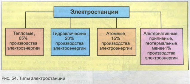 Хозяйство России § 19. ТЭК: электроэнергетика РоссииВспомните 1. Какие реки России являются наиболее полноводными? 2. в какой части страны они расположены? Особенности отраслиЭлектроэнергетика объединяет процессы выработки и передачи электроэнергии. Продукция этой отрасли весьма специфическая — электрическая энергия. Специфика состоит в том, что её почти невозможно накапливать. Следовательно, произведённую электроэнергию нужно сразу же направлять потребителям. Поэтому-то в состав отрасли входят не только сотни электростанций, но и десятки тысяч километров линий электропередачи. Работа современного предприятия любой отрасли хозяйства невозможна без электричества. Уровень обеспеченности страны электроэнергией определяет степень развития её экономики. Причём электроэнергетика способна воздействовать и на размещение производства, и на набор отраслей в том или ином районе. В России ежегодно вырабатывается более 900 млрд кВт • ч электроэнергии. Страна занимает четвёртое место в мире по выработке электроэнергии, уступая только США, Японии и Китаю. Типы электростанцийОсновная часть электроэнергии в стране производится на тепловых, гидравлических и атомных электростанциях (рис. 54).