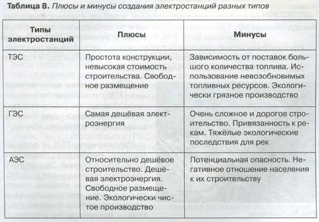 65% вырабатываемой в стране электроэнергии дают тепловые электростанции (ТЭС). Конструкция ТЭС довольно проста. Это паровой котёл, из которого пар под огромным давлением поступает к турбине. Струя пара вращает турбину, и это вращение преобразовывается в электроэнергию. На самом деле всё, конечно, сложнее, но основной принцип именно таков. Почему тепловая энергетика лидирует в выработке электроэнергии в России? Связано это с высокой обеспеченностью страны топливными ресурсами и техническими условиями создания ТЭС (табл. 8).