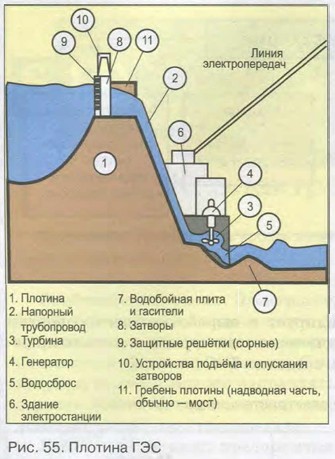 Самые мощные из тепловых электростанций называются государственными районными электростанциями (ГРЭС). Мощность каждой из таких станций часто превышает 2 млн кВт. ГРЭС обычно строят в районах наибольшего потребления электроэнергии (Центральный, Уральский и Северо-Западный экономические районы), а также рядом с местами добычи дешёвого топлива (в основном на востоке страны). Сургутская, Костромская и Рефтинская ГРЭС являются наиболее крупными тепловыми электростанциями нашей страны. Особый вид тепловых электростанций — это теплоэлектроцентрали (ТЭЦ), которые производят не только электроэнергию, но и тепло (нагретый пар,горячую воду). В отличие от ТЭС теплоэлектроцентрали можно размещать только рядом с населёнными пунктами, так как расстояние, на которое можно подавать нагретый пар и горячую воду по трубам, невелико — максимум 20 км. Гидравлические электростанции (ГЭС) используют энергию падающей воды. Их работа основана на использовании практически неисчерпаемого источника энергии. Строительство ГЭС — дело непростое. Необходимо перекрыть русло реки плотиной. За счёт этого создаётся перепад высот (рис. 55).