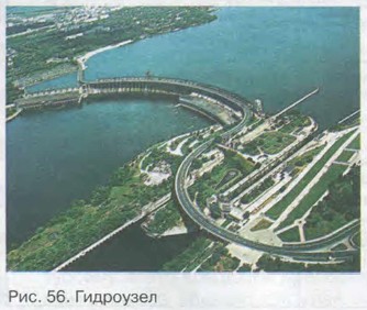 По специальным каналам внутри плотины вода устремляется вниз и вращает турбину. Конечно, плотина — важнейший, но не единственный элемент ГЭС; при ней создаётся целый гидроузел (рис. 56). В результате строительство ГЭС занимает много времени и требует огромных средств. Но зато после постройки эксплуатация ГЭС больших затрат не требует. Ведь ГЭС использует бесплатную энергию реки, а её работой управляет смена, состоящая всего из нескольких операторов. В результате оказывается, что производимая ГЭС электроэнергия примерно в 5—6 раз дешевле той, что вырабатывается на тепловых электростанциях.